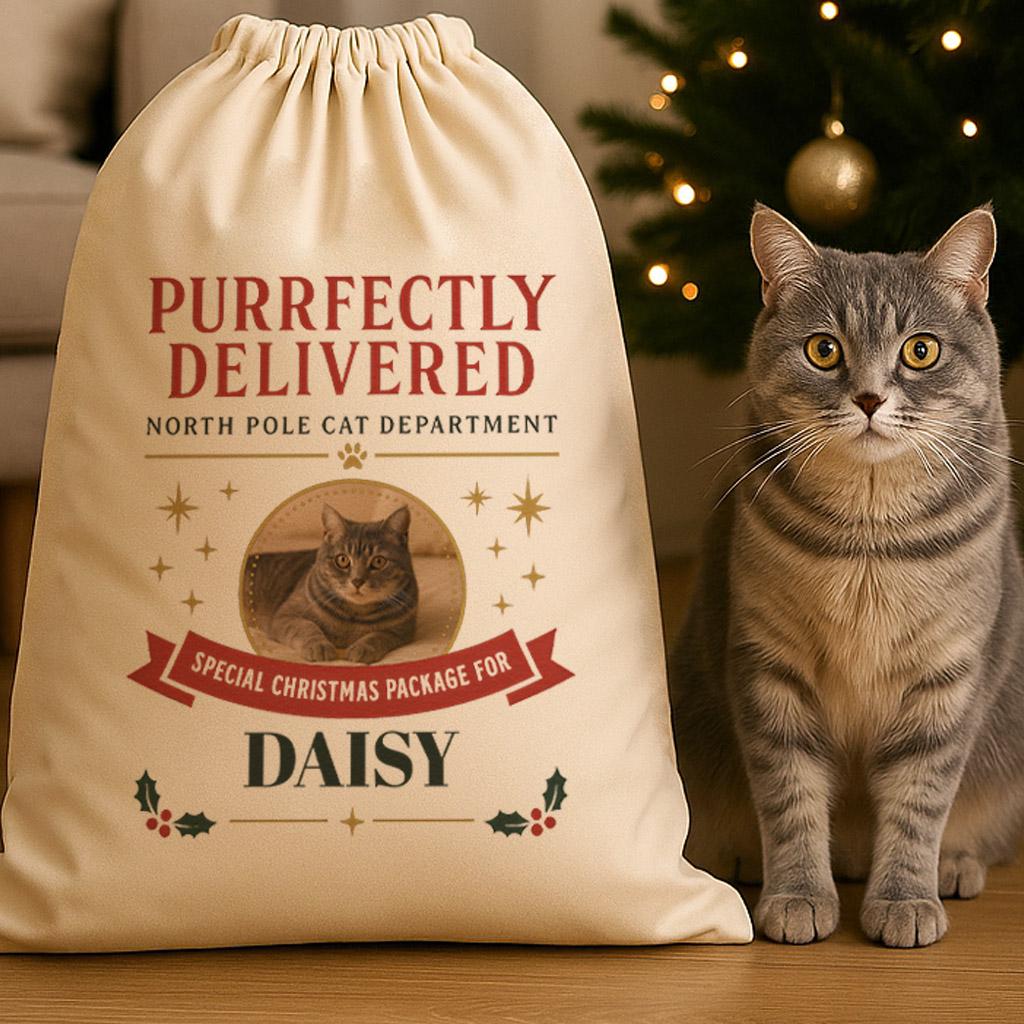 Personalised Photo Cat Santa Sack Purrfectly Delivered - Pet Cat Chrsitmas Santa Sack - Christmas Gift - Christmas Eve Box - Santa Paws